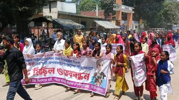 বিরলে ছাত্রী যৌন নিপীড়নের অভিযোগে সহকারী শিক্ষক এর বিরুদ্ধে বিক্ষোভ মিছিল ও মানববন্ধন