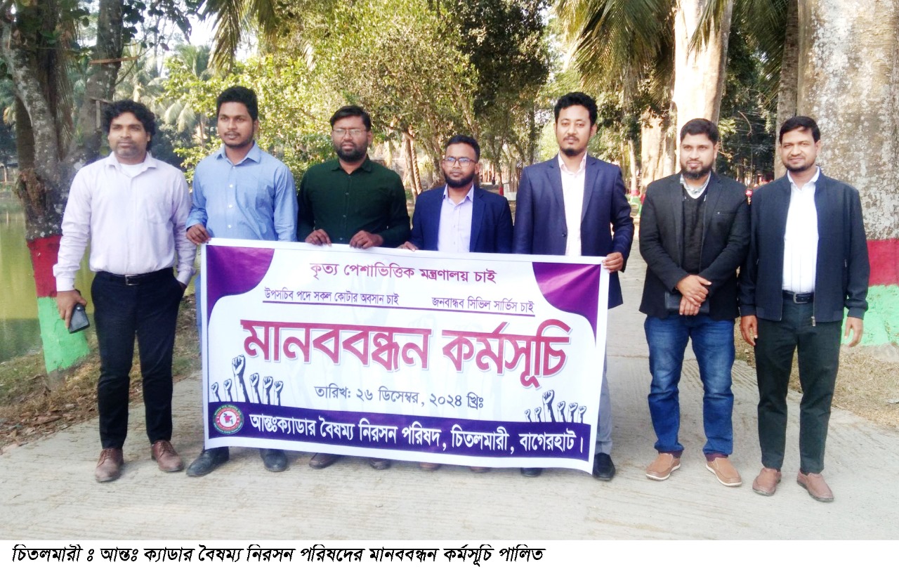 জনপ্রশাসন সংস্কার কমিশন কর্তৃক প্রস্তাবিত শিক্ষা ওস্বাস্থ্য ক্যাডার বিলুপ্তি সংক্রান্ত সুপারিশ প্রত্যাখ্যান ও উপসচিব পদে সকল ধরনের কোটা বাতিলের দাবিতে বাগেরহাটের চিতলমারীতে মানববন্ধন করেছে সিভিল সার্ভিস ক্যাডারের কর্মকর্তারা। বৃহস্পতিবার বেলা ১১ টার দিকে উপজেলা পরিষদের সামনে বিভিন্ন দপ্তরের কর্মকর্তারা এতে অংশ নেন।