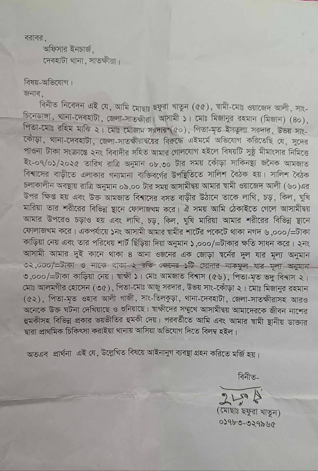 সাতক্ষীরা জেলার দেবহাটার পল্লীতে টাকা সংক্রান্ত বিরোধকে কেন্দ্র করে প্রতিপক্ষের মারপিটে স্বামী ও স্ত্রী আহত হয়েছে। এ ঘটনায় আহত উপজেলার চিনেডাঙ্গা গ্রামের ওয়াজেদ আলীর স্ত্রী ছফুরা খাতুন বাদী হয়ে দেবহাটা থানায় একটি লিখিত অভিযোগ দায়ের করেছে। অভিযোগ মতে জানা গেছে, সুদের টাকা সংক্রান্ত বিষয়ের বিরোধ মীমাংসার জন্য গত ৭ জানুয়ারী রাত ৮টার দিকে কোঁড়া গ্রামেের আমজাত হোসেনের বাড়িতে স্থানীয় গন্যমান্য ব্যক্তিবর্গের উপস্থিতিতে এক শালিশ মিমাংসা চলাকালীন সময়ে বিবাদী কোঁড়া গ্রামের রহিম মাঝির ছেলে মিজানুর রহমান মিজান ও একই গ্রামের মৃত ইসতুল্য সরদারের ছেলে মোজাম সরদার একত্রে মিলে বাদী ছফুরা খাতুনের স্বামী ওয়াজেদ আলীকে মারপিট করে। শালিশ মিমাংসা চলাকালীন আকষ্মিক মারপিটের ঘটনায় স্থানীয় গন্যমান্য ব্যক্তিবর্গ হতবিহ্বল হয়ে পড়ে। সেসময় বাদী ছফুরা তার স্বামী ওয়াজেদ আলীকে মারপিটের থেকে ঠেকাইতে গেলে প্রতিপক্ষরা বাদীকেও মারপিট করে। একপর্যায়ে উপস্থিত ব্যক্তিবর্গ তাদেরকে মারপিটের হাত থেকে রক্ষা করে। পরে বাদীকে স্থানীয়ভাবে ও তার স্বামীকে সখিপুরস্থ দেবহাটা উপজেলা স্বাস্থ্য কমপ্লেক্স থেকে চিকিৎসা করানো হয়। এঘটনা উল্লেখ করে বাদী ছফুরা খাতুন দেবহাটা থানায় একটি লিখিত অভিযোগ দায়ের করেছেন। দেবহাটা থানার অফিসার ইনচার্জ হযরত আলী অভিযোগের বিষয়ে তদন্তপূর্বক আইনগত ব্যবস্থা গ্রহন করা হবে বলে জানিয়েছেন।
