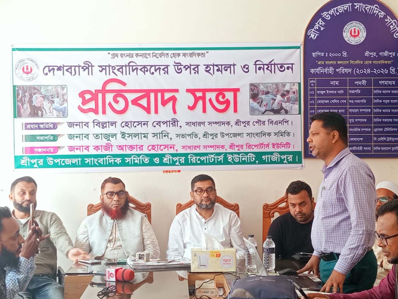শ্রীপুর উপজেলা সাংবাদিক সমিতির সভাপতি তাজুল ইসলাম সানির সভাপতিত্বে এবং শ্রীপুর রিপোর্টার্স ইউনিটির সাধারণ সম্পাদক কাজী আকতার হোসেনের নেতৃত্বে সাংবাদিকদের উপর হামলা নির্যাতনের প্রতিবাদ সভায় আরো বক্তব্য রাখেন শ্রীপুর উপজেলা সাংবাদিক সমিতির প্রতিষ্ঠাতা রায়হানুল ইসলাম আকন্দ, মোহনা টেলিভিশন ও যায়যায়দিনের প্রতিনিধি প্রভাষক আলফাজ সরকার আকাশ, এশিয়ান টিভির গাজীপুর প্রতিনিধি মাহমুদুল হাসান, শ্রীপুর উপজেলা সাংবাদিক সমিতির সাধারণ সম্পাদক মাসুদ রানা, সাংগঠনিক সম্পাদক আব্দুর রউফ রুবেল, সাবেক সভাপতি আনিছুর রহমান শামীম, সাবেক সাধারণ সম্পাদক সেলিম শেখ, সাবেক সাংগঠনিক সম্পাদক এমদাদুল হক ও আবু সাঈদ, কোষাধ্যক্ষ সাদেক মিয়া, এস এম জরিুল ইসলাম, শ্রীপুর পৌর ছাত্রদলের সদস্য সচিব আজিজুল হক রাজন, দৈনিক আজকের দর্পনের প্রতিনিধি নাজমুল হাসান প্রমুখ।