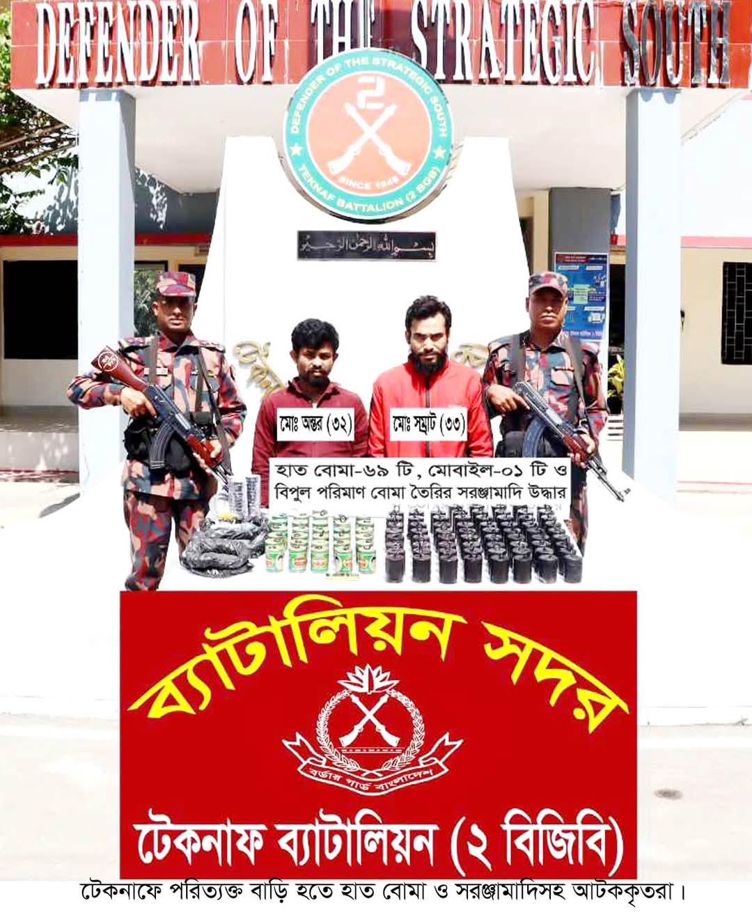 টেকনাফ ২বিজিবি ব্যাটালিয়নের অধিনায়ক লেঃ কর্ণেল আশিকুর রহমান (পিএসসি) জানান,১৬ ফেব্রুয়ারী ভোররাত ৩টায় টেকনাফ বিজিবি ব্যাটালিয়নের আওতাধীন হ্নীলা বিওপির দায়িত্বপূর্ণ হ্নীলা ফুলের ডেইল এলাকার ১টি জরাজীর্ণ বাড়িতে কতিপয় দুষ্কৃতকারী বোমা তৈরীর সরঞ্জামাদিসহ অবস্থানের গোপন সংবাদের ভিত্তিতে ব্যাটালিয়ন অধিনায়কের নেতৃত্বে বিশেষ অভিযানিক দল বাড়িটি ঘেরাও করে অভিযান চালায়। প্রায় ৩ ঘন্টা ধরে ব্যাপক তল্লাশী চালিয়ে একটি জরাজীর্ণ ঘরের ভেতর থেকে তৈরিকৃত ৬৯টি হাত বোমা, ১.৬ কেজি সালফার, ১.৩ কেজি লালা, ৩১টি জর্দার কৌটা, ২২০ গ্রাম গুনাতার এবং ১টি প্লাসসহ চাঁদপুরের মতলব উত্তর থানার নবুরকান্দি গ্রামের নজরুল ইসলামের পুত্র মোঃ সম্রাট প্রধান (৩৩) এবং নারায়নগঞ্জ বন্দর থানার দক্ষিণ গারমোরা গ্রামের সাইফুল ইসলামের পুত্র মোঃ অন্তর (৩২) কে আটক করতে সক্ষম হলেও আরো ২জন ব্যক্তি পালিয়ে যেতে সক্ষম হয়।