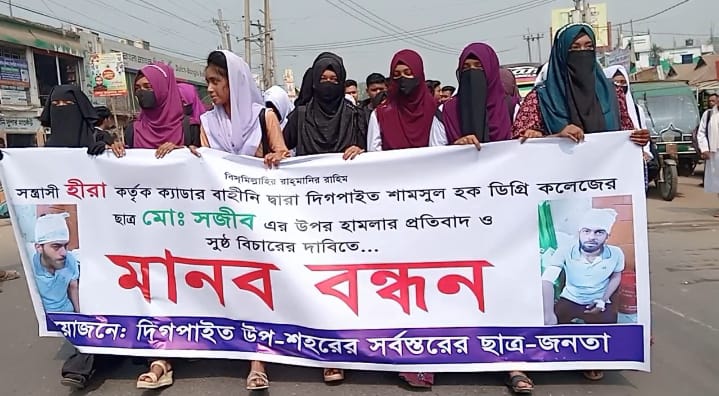 জামালপুর সদর উপজেলার দিগপাইত উপশহরের সন্ত্রাসী হীরা কতৃক ক্যাডার বাহিনী দ্বারা দিগপাইত শামসুল হক ডিগ্রী কলেজের ছাত্র সজীবের উপর সন্ত্রাসী হামলার প্রতিবাদ ও সুষ্ঠু বিচারের দাবিতে মানববন্ধন করেছেন দিগপাইত উপশহরের সর্বস্তরের ছাত্র সমাজ। মানববন্ধনে স্থানীয়