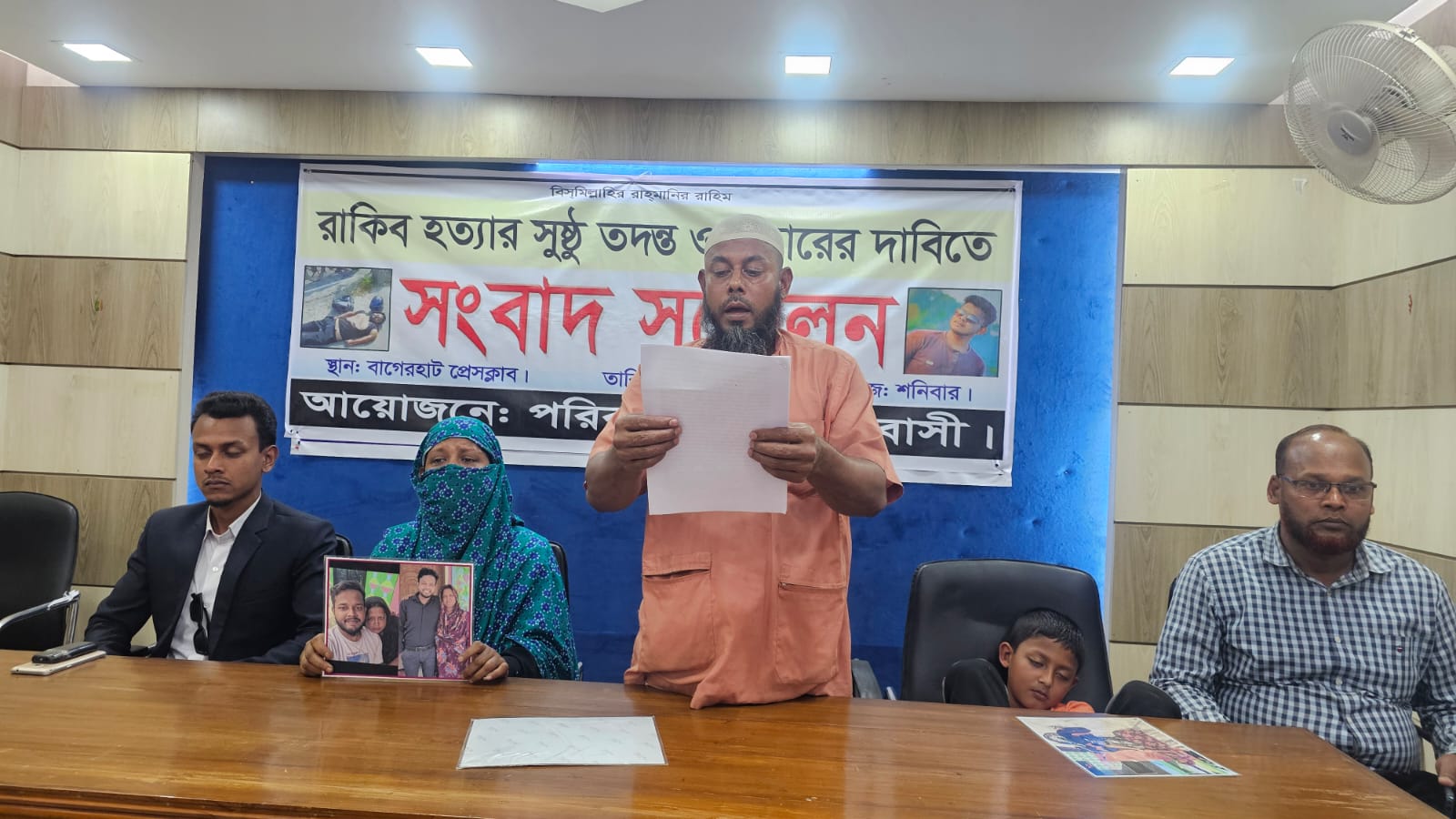 শনিবার (১ মার্চ) দুপুরে বাগেরহাট প্রেসক্লাবে সংবাদ সম্মেলনে শাহীন হাওলাদার দাবি করেন, ছয় বছর ধরে প্রেমের সম্পর্কে থাকা তাঁর একমাত্র ছেলে রাকিবকে ঠান্ডা মাথায় পরিকল্পিতভাবে হত্যা করা হয়েছে। তিনি বলেন, এটি কোনো দুর্ঘটনা নয়, বরং পূর্বপরিকল্পিত হত্যাকাণ্ড। আমি আমার ছেলের হত্যার ন্যায়বিচার চাই!