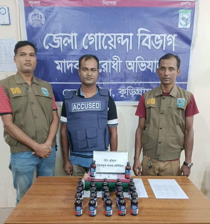 কুড়িগ্রাম জেলা গোয়েন্দা শাখা (ডিবি) পুলিশের একটি চৌকস টিম অদ্য ২৩ আগস্ট ২০২৪ দুপুর আনুমানিক ১২:৩০ ঘটিকায় গোপন সংবাদের ভিত্তিতে কুড়িগ্রাম সদরের কেতারমোড় টু উলিপুর রোডে ধাওয়া করে উলিপুর থানাধীন পাঁচপীর এলাকায় একটি মোটরসাইকেলযোগে মাদক পরিবহনের সময় ২২ বোতল ফেন্সিডিল সহ পূর্বের ৫ টি মাদক মামলার আসামী কুড়িগ্রামের নাগেশ্বরী দক্ষিণ রামখানা এলাকার শ্রী স্বপন কুমার দাস (৪০) কে হাতেনাতে গ্রেফতার করে। এ সময় মাদক পরিবহনে ব্যবহৃত মোটরসাইকেলটি জব্দ করে পুলিশ।