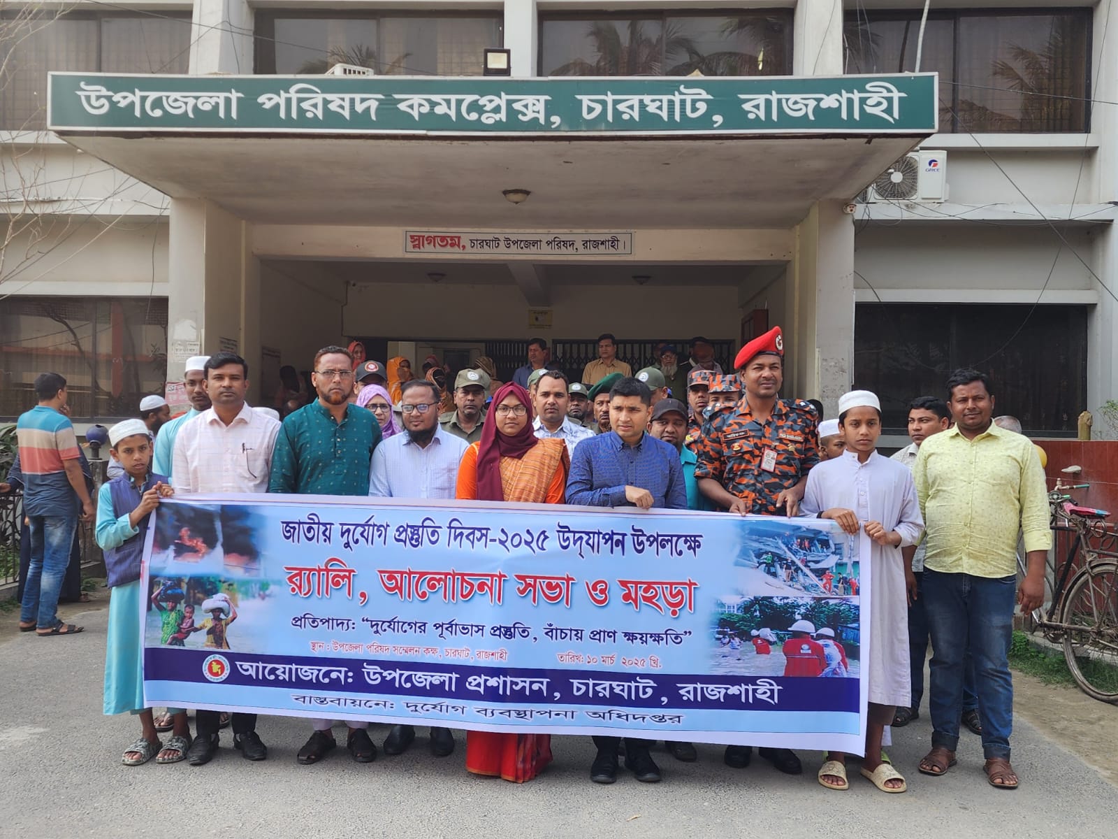 চারঘাটে জাতীয় দুর্যোগ প্রস্ততি দিবসে ভুমিকম্প ও অগ্নিকান্ডে করনীয় মহড়া