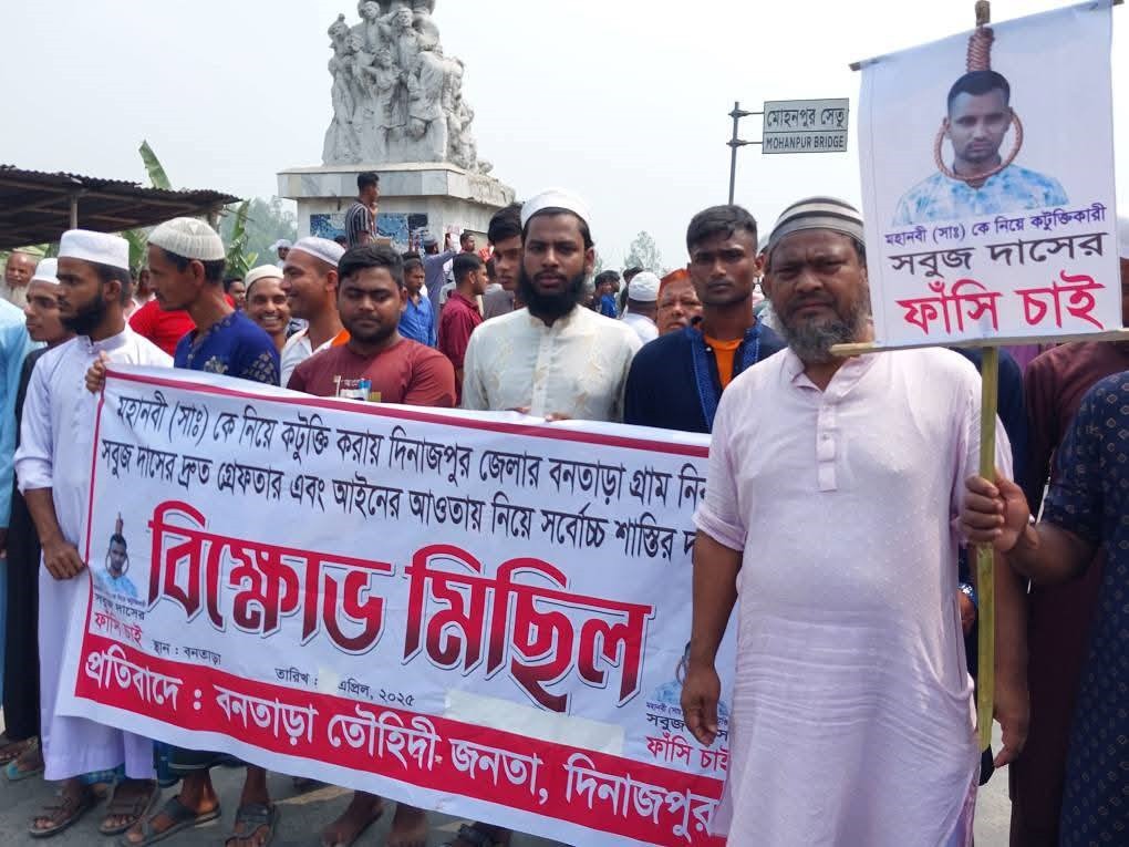 দিনাজপুর, ৬ এপ্রিল ২০২৫: মহানবী হযরত মুহাম্মদ (সা.)-কে কটূক্তি করে ফেসবুকে পোস্ট দেওয়ার প্রতিবাদে আজ দিনাজপুরের আমবাড়ী বাজারে বিক্ষুব্ধ জনতা রাস্তা অবরোধ করেছে।