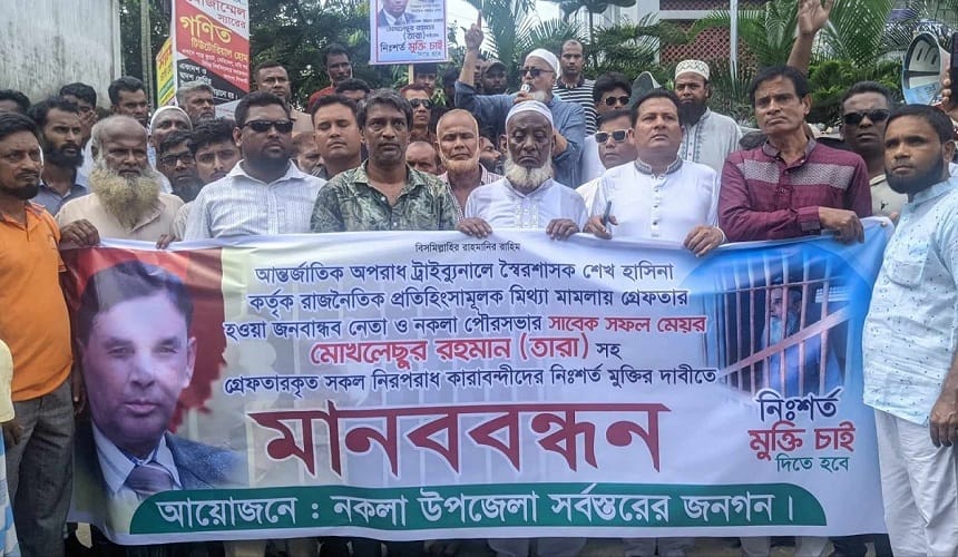 বক্তরা বলেন, মোখলেছুর রহমান তারা একজন দেশপ্রেমিক স্বচ্ছ রাজনীতিবিদ। তারা জানান, ১৯৭১ সালের মুক্তিযুদ্ধকালে মোখলেছুর রহমান তারা’র বয়স ছিল ১০ বছর। তার জন্ম তারিখ ১০ অক্টোবর ১৯৬০ খ্রি.। কিন্তু আওয়ামী সরকারের শাসনামলে রাজনৈতিক প্রতিহিংসামূলক যুদ্ধাপরাধের মিথ্যা মামলায় তাকে আসামী করা হয়। পরে আন্তর্জাতিক অপরাধ ট্রাইব্যুনালের প্রহশনের বিচারে বর্তমানে তিনি জেলখানায় বন্দি আছেন। অন্তবর্তীকালিন সরকারের নিকট মোখলেছুর রহমান (তারা) সহ গ্রেফতারকৃত সকল নিরাপরাধ কারাবন্দীদের নিঃশ্বর্তে মুক্তির দাবি জানান বক্তরা। দ্রæত সময়ের মধ্যে আওয়ামী লীগ সরকারের স্থানীয় নেতৃবৃন্দ কর্তৃক রাজনৈতিক প্রতিহিংসামূলক মিথ্যা মামলায় গ্রেফতার হওয়া নকলা পৌরসভার সাবেক মেয়র ও পৌর বিএনপির সভাপতি মোখলেছুর রহমান (তারা) সহ গ্রেফতারকৃত সকল নিরাপরাধ কারাবন্দীদের নিঃশ্বর্তে মুক্তি না দিলে পরবর্তীতে কর্মসূচি ঘোষণা করা হবে বলে বক্তারা জানান দিয়েছেন।