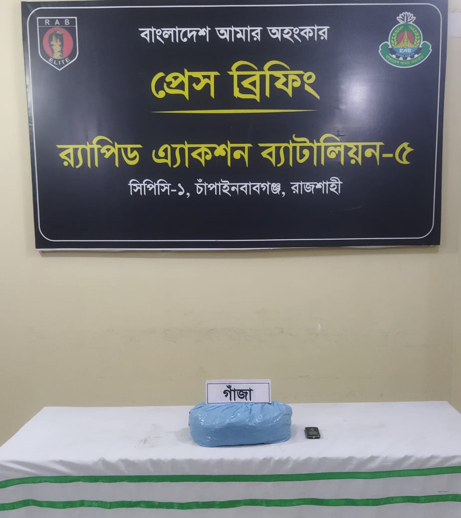 আজ ২৫ আগস্ট ২০২৪ ইং রবিবার ১৮:৩০ ঘটিকায় র্যাব-৫, রাজশাহী, সিপিসি-১ এর একটি আভিযানিক দল চাঁপাইনবাবগঞ্জ জেলার সদর থানাধীন পৌরসভাস্থ ২নং ওয়ার্ডের পশ্চিম পাঠান পাড়া খাঁন অটো গ্যারেজের সামনে অভিযান পরিচালনা করে মাদক সরবরাহের সময় ১। মোঃ রবিউল ইসলাম (২৮), পিতা-মোঃ সিরাজুল ইসলাম, সাং-পুরাতন বাজার (স্বর্ণ পট্টি), থানা-চাঁপাইনবাবগঞ্জ সদর, জেলা-চাঁপাইনবাবগঞ্জকে ০২ কেজি গাঁজা সহ গ্রেফতার করে।