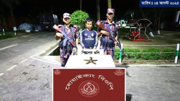 কক্সবাজারের টেকনাফে বিশেষ অভিযানে এক রোহিঙ্গা যুবকের কাছ থেকে পিস্তলের ৫ রাউন্ড গুলি উদ্ধার করেছে বর্ডার গার্ড বাংলাদেশ (৬৪ বিজিবি)। এসময় তাকে আটক করা হয়েছে, সোমবার (৪ আগস্ট) সকাল সাড়ে ১০টার দিকে হোয়াইক্যং বিওপির দায়িত্বপূর্ণ এলাকার ওবিএম পোস্টের সামনে দিয়ে নৌকাযোগে আসতে দেখে সন্দেহ হলে বিজিবি সদস্যরা তাকে জিজ্ঞাসাবাদ ও তল্লাশি করেন। এক পর্যায়ে তার সঙ্গে থাকা একটি কালো ব্যাগ থেকে ৯ মি.মি. পিস্তলের ৫ রাউন্ড গুলি উদ্ধার করা হয়,আটককৃত যুবক উখিয়ার বালুখালী ১৭ নম্বর রোহিঙ্গা ক্যাম্পের আমির হাকিমের ছেলে মো. আমিন (১৮)।