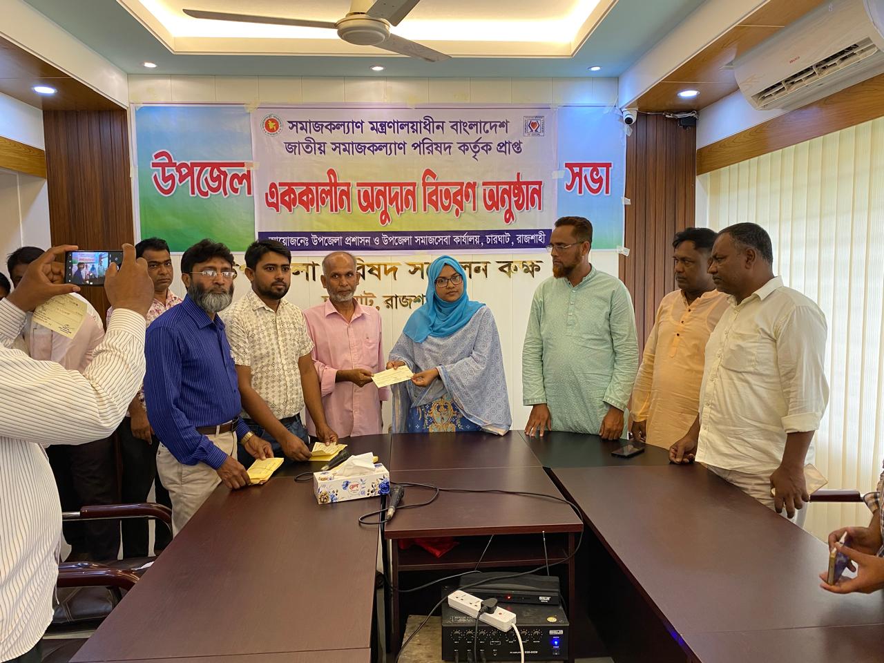 রাজশাহীর চারঘাটে প্রতিবন্ধীদের হুইল চেয়ার ও অন্যান্য সহায়ক উপকরণ ও এককালীন অনুদান বিতরন অনুষ্ঠান অনুষ্ঠিত হয়েছে। উপজেলা প্রশাসন ও উপজেলা সমাজসেবা কার্যালয় আয়োজনে সমাজকল্যাণ মন্ত্রণালয়াধীন জাতীয় প্রতিবন্ধী উন্নয়ন ফাউন্ডেশন ও বাংলাদেশ জাতীয় সমাজকল্যাণ পরিষদ কতৃর্ক প্রাপ্ত হুইল চেয়ার ও অন্যান্য সহায়ক উপকরণ এবং এককালীন অনুদান বিতরন অনুষ্ঠান অনুষ্ঠিত হয়। বৃহস্পতিবার (২৮ আগস্ট) সকাল ১১টায় উপজেলা পরিষদ কক্ষে আলোচনা সভা ও এককালীন অনুদান চেক বিতরন করা হয়।