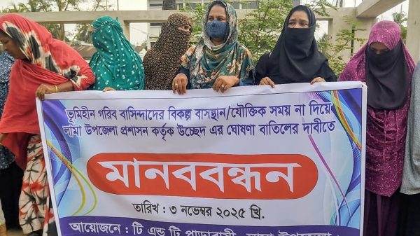 বান্দরবান জেলার লামা উপজেলা পরিষদের জায়গায় উদ্ধারে জেলা প্রশাসনের উচ্ছেদ বন্ধের দাবিতে মানববন্ধন করেছেন বসবাসকারী পরিবারের সদস্যরা।
