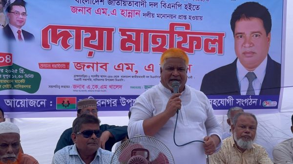 দোয়া মাহফিলে উপস্থিত নেতাকর্মীরা এম এ হান্নানের নির্বাচনী সফলতা এবং বিএনপির বিজয়ের জন্য বিশেষ মোনাজাত করেন।