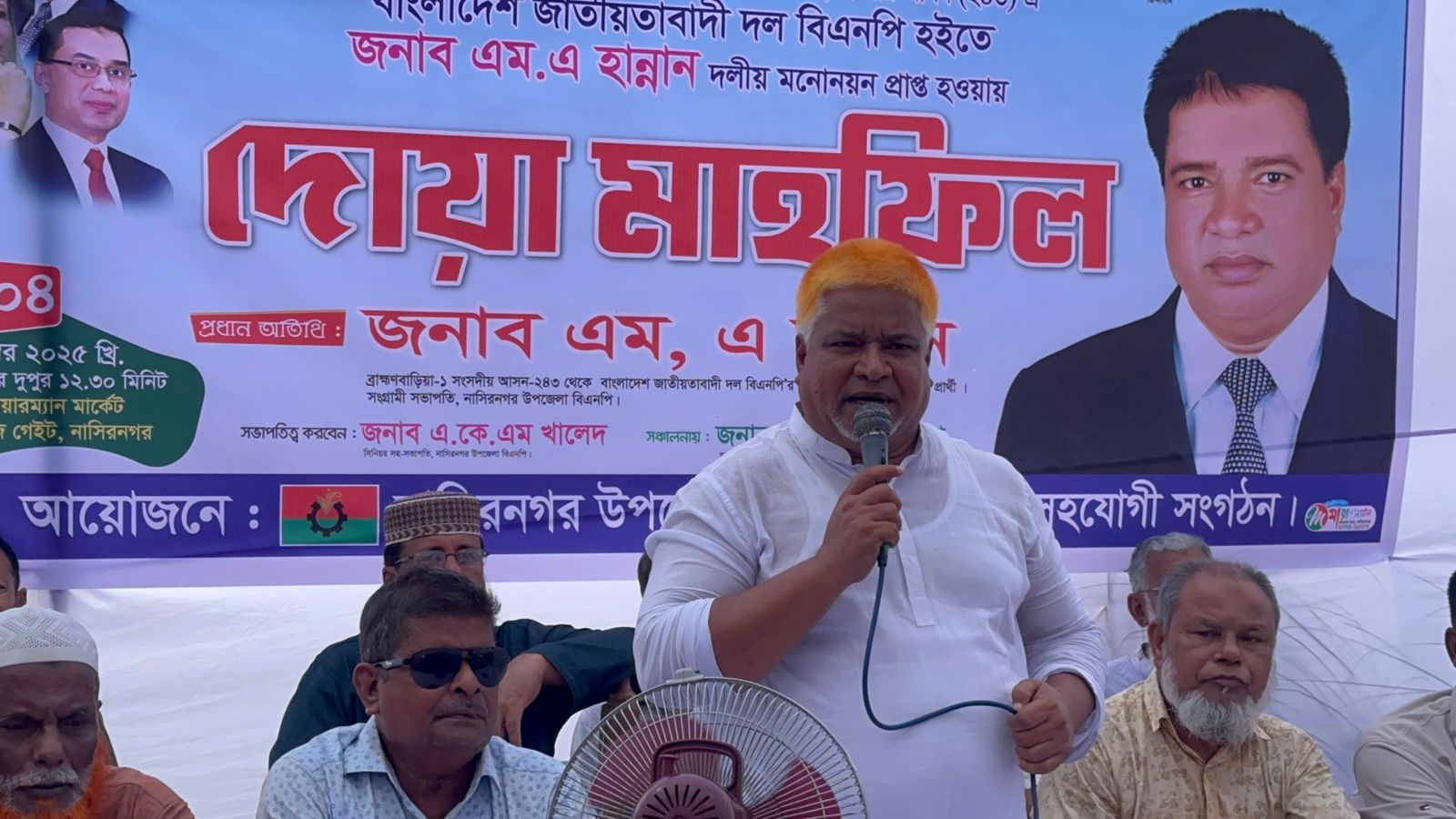 নাসিরনগরে বিএনপির মনোনীত প্রার্থী এম এ হান্নানকে শুভেচ্ছা ও দোয়া মাহফিল