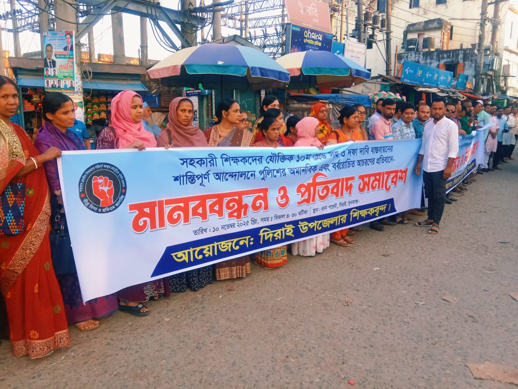 সহকারী শিক্ষকদের ১০ম গ্রেডসহ তিন দফা দাবির বাস্তবায়নের আন্দোলনে পুলিশের হামলার প্রতিবাদে দিরাইয়ে মানববন্ধন ও প্রতিবাদ সমাবেশ অনুষ্ঠিত হয়েছে।