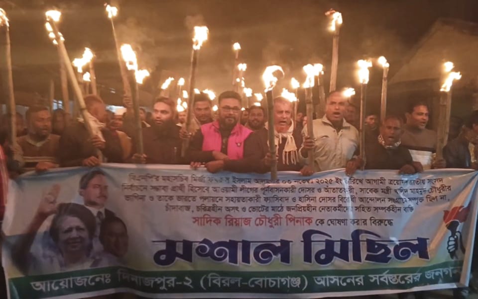 শুক্রবার সন্ধ্যায় প্রতিবাদের অংশ হিসেবে বিরল উপজেলার ৩ নং ধামইর ইউনিয়নের ঢেরাপাটিয়া বাজারে বিএনপি ও অঙ্গ সহযোগী সংগঠনের বিপুল সংখ্যক নেতাকর্মীসহ সহস্রাধিক মশাল নিয়ে মিছিলে অংশগ্রহণ করেন।