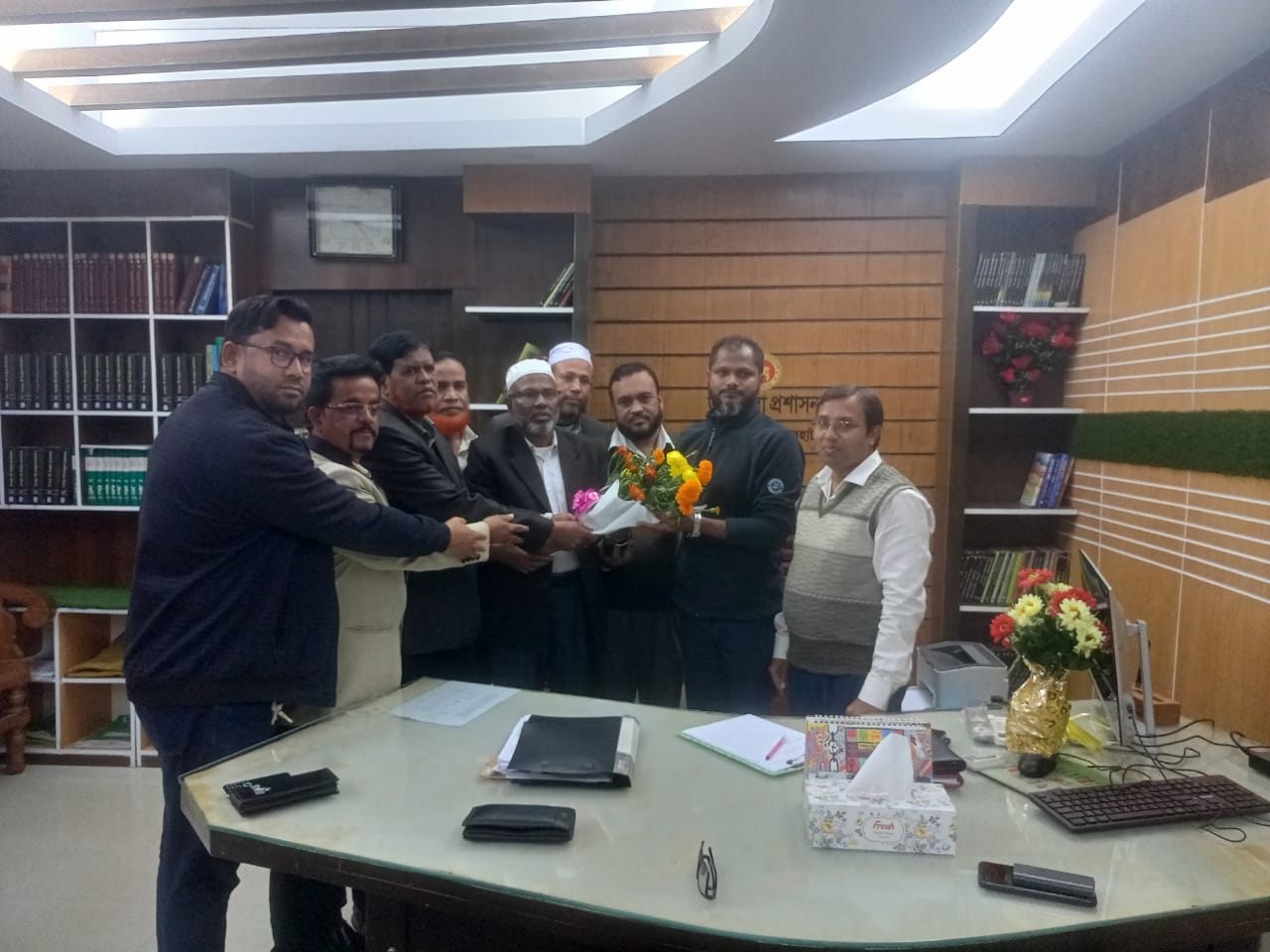 শরণখোলায় নবাগত উপজেলা নির্বাহী কর্মকর্তাকে ফুল দিয়ে শুভেচ্ছা বিনিময় করেন শিক্ষক নেতারা।