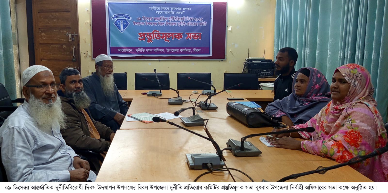 ০৯ ডিসেম্বর আন্তর্জাতিক দুর্নীতিবিরোধী দিবস উদযাপন উপলক্ষ্যে বিরল উপজেলা দুর্নীতি প্রতিরোধ কমিটির প্রস্তুতিমূলক সভা বুধবার উপজেলা নির্বাহী অফিসারের সভা কক্ষে অনুষ্ঠিত হয়েছে।