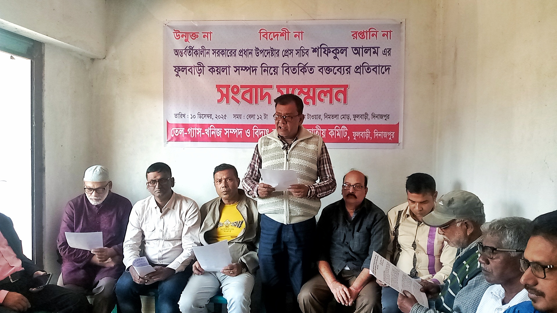 সংবাদ সম্মেলনে তেল গ্যাস খনিজ সম্পদ ও বিদ্যুৎ বন্দর রক্ষা জাতীয় কমিটির ফুলবাড়ী উপজেলা শাখার আহ্বায়ক সৈয়দ সাইফুল ইসলাম জুয়েল লিখিত বক্তব্যে বলেন আমরা উদ্বেগের সাথে জানাচ্ছি বর্তমান অন্তর্বর্তীকালীন সরকারের প্রধান উপদেষ্টার প্রেস সচিব শফিকুল আলম গত ৬ ডিসেম্বর ২০২৫-খ্রিটাব্দে তাঁর ফেসবুক ভেরিফাইড পেইজে ফুলবাড়ী নিয়ে ইতিহাস বিকৃতির এবং লুটপাটের সাফাই দিয়েছেন।