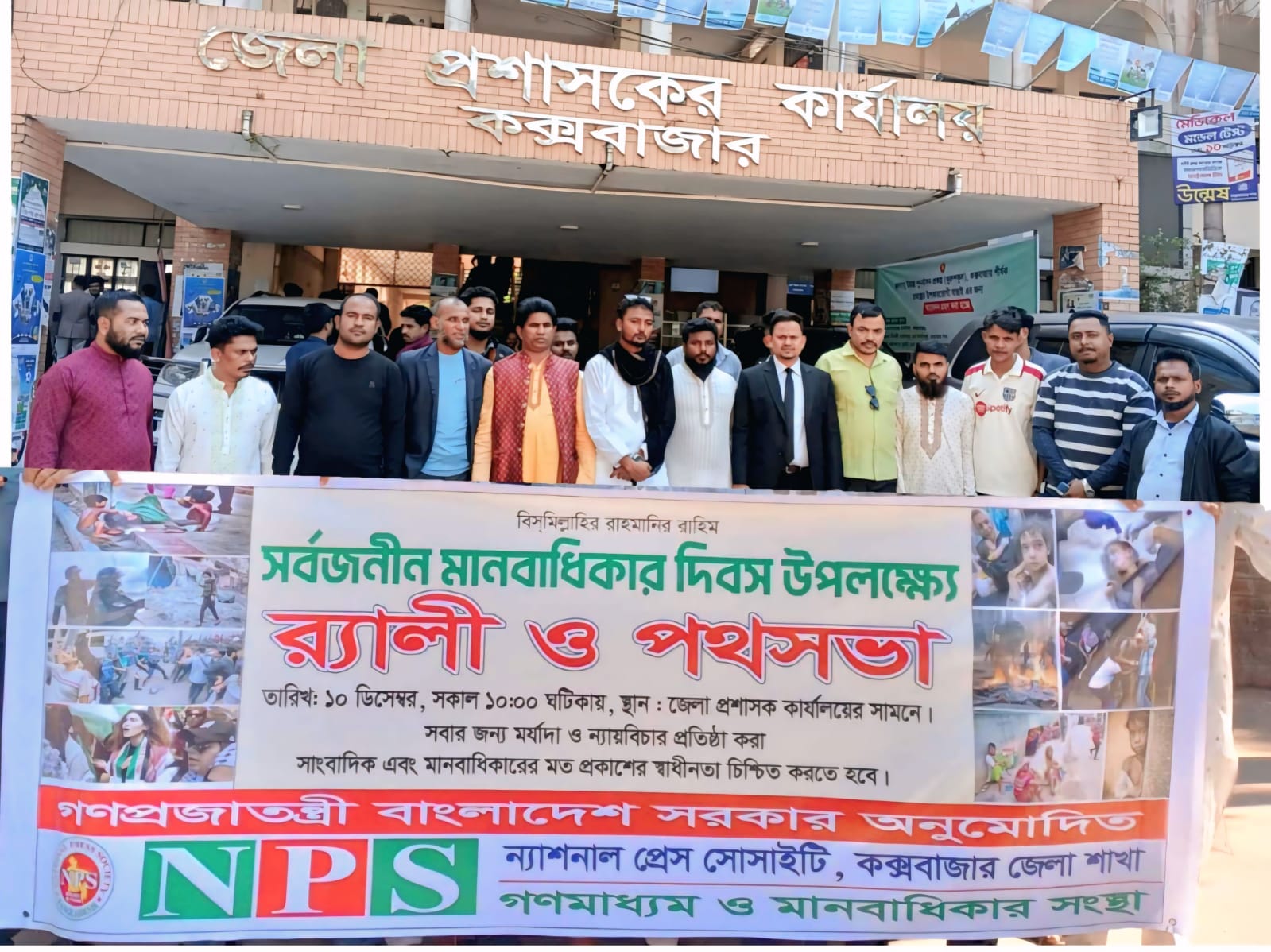সর্বজনীন মানবাধিকার দিবস উপলক্ষে কক্সবাজার জেলা প্রশাসক কার্যালয়ের সামনে আজ ১০ ডিসেম্বর সকালে একটি র্যালি ও পথসভা অনুষ্ঠিত হয়েছে। সকাল ১০টায় শুরু হওয়া এই কর্মসূচিতে সাংবাদিক, মানবাধিকারকর্মী, সমাজের বিভিন্ন শ্রেণি–পেশার মানুষ এবং তরুণ প্রতিনিধিরা অংশ নেন।