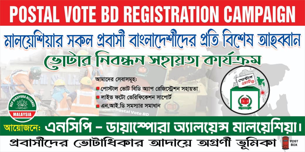 প্রবাসী বাংলাদেশিদের পোস্টাল ভোট BD অ্যাপের মাধ্যমে দ্রুত ও সহজে রেজিস্ট্রেশন নিশ্চিত করতে রবিবার ১১ নভেম্বর ২০২৫ এনসিপি ডায়াস্পোরা অ্যায়লেন্স মালয়েশিয়ার উদ্যোগে এক গুরুত্বপূর্ণ অনলাইন মিটিং অনুষ্ঠিত হয়েছে।