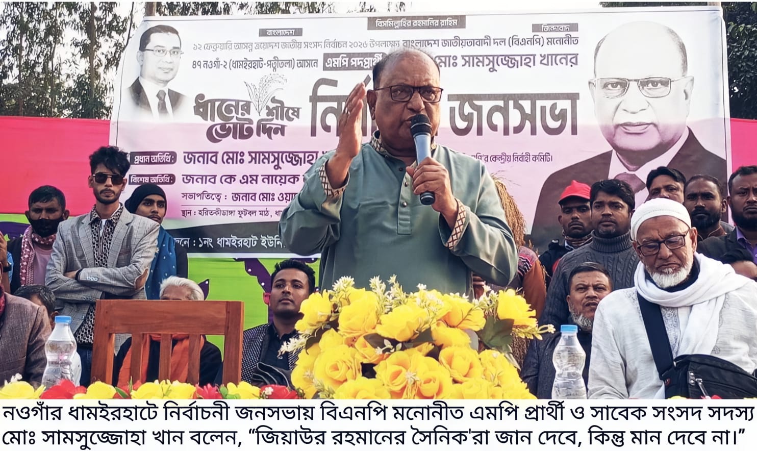 নওগাঁর ধামইরহাটে নির্বাচনী জনসভায় বিএনপি মনোনীত এমপি প্রার্থী ও সাবেক সংসদ সদস্য মোঃ সামসুজ্জোহা খান বলেন, “জিয়াউর রহমানের সৈনিক'রা জান দেবে, কিন্তু মান দেবে না।”