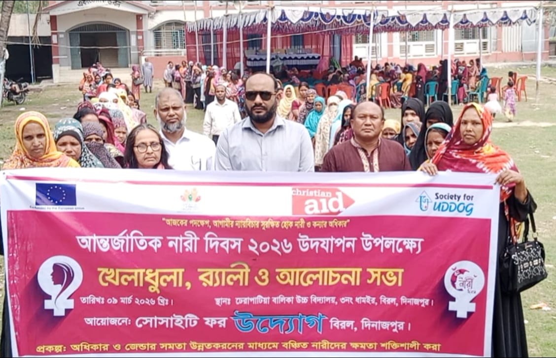 দিনাজপুরের বিরল উপজেলার ধামইর ইউনিয়নে সোসাইটি ফর উদ্যোগ এর আয়োজনে অধিকার ও জেন্ডার সমতা উন্নতকরণের মাধ্যমে বঞ্চিত নারীদের ক্ষমতা শক্তিশালী করা প্রকল্পের আওতায় আন্তর্জাতিক নারী দিবস-২০২৬ উপলক্ষ্যে খেলাধূলা, র্যালী ও আলোচনা সভা এবং পুরস্কার বিতরণ অনুষ্ঠিত হয়েছে। আজকের পদক্ষেপ, আগামীর ন্যায়বিচার, সুরক্ষিত হোক নারী ও কন্যার অধিকার- প্রতিপাদ্য নিয়ে এবার বিশ্বের অন্যান্য দেশের সাথে বাংলাদেশও দিবসটি উদযাপিত হয়েছে।