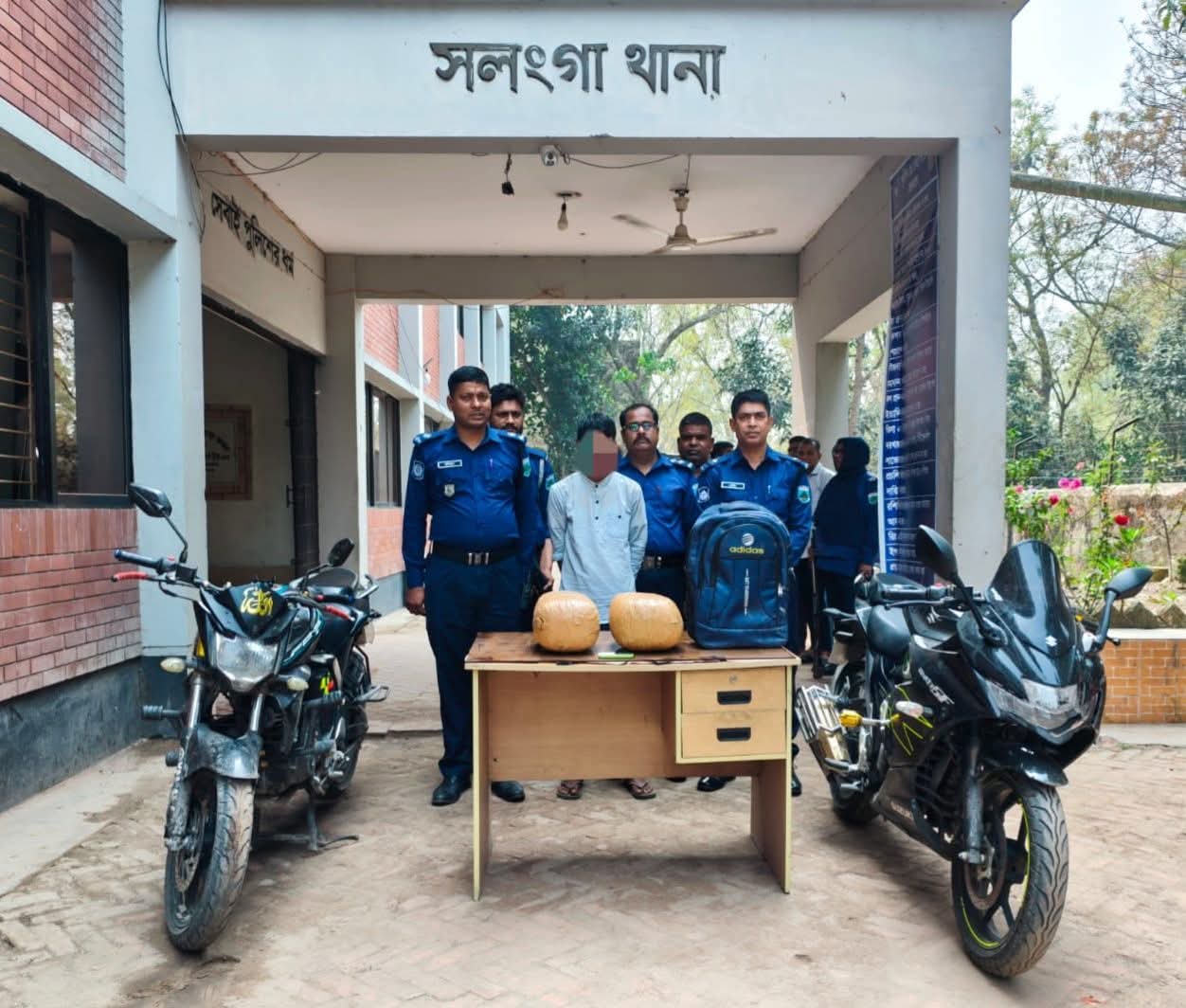 বিশেষ অভিযান পরিচালনাকালে ০৯/০৩/২০২৬ খ্রি. সন্ধ্যা ১৮.১০ ঘটিকায় সলংগা থানাধীন চড়িয়া শিকার মধ্যপাড়া সাকিনস্ত সোনালী ব্যাংক পিএলসি এর সামনে ঢাকা - নাটোর মহা সড়কের উপর চেকপোষ্ট পরিচালনা করাকালীন সময়ে ০৮ (আট) কেজি গাঁজাসহ সেলিম উদ্দিন নামে একজন মাদক কারবারিকে গ্রেফতার করা হয়।