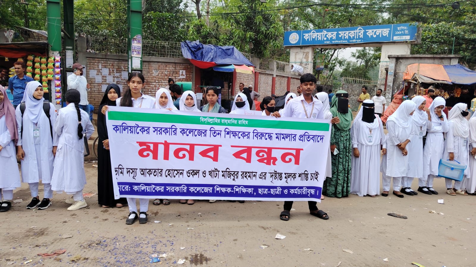 মানববন্ধনে অংশগ্রহণকারীরা অভিযোগ করেন, সম্প্রতি কলেজের আওতাধীন জমিতে একটি মসজিদ নির্মাণের উদ্যোগ নেয় কলেজ কর্তৃপক্ষ। এ সময় স্থানীয়ভাবে ভূমিদস্যু হিসেবে পরিচিত আকতার হোসেন ওকল ও খাটা মজিবুর রহমান উক্ত জমি নিজেদের দাবি করে নির্মাণ কাজে বাধা প্রদান করেন। পরবর্তীতে তারা আদালতে কলেজের তিন শিক্ষকের বিরুদ্ধে মামলা দায়ের করেন।