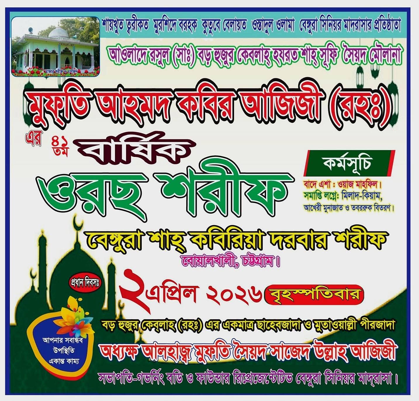 বোয়ালখালীতে বড় হুজুর হিসেবে পরিচিত হযরত শাহ সূফি সৈয়দ মৌলানা মুফতি আহমদ কবির আজিজী রহমাতুল্লাহি আলাইহির বার্ষিক ওরশ শরীফ আগামী ২এপ্রিল, বৃহস্পতিবার অনুষ্ঠিত হবে। (এবছর রমজানের কারণে ১৯ মার্চের পরিবর্তে ২এপ্রিল‘২০২৬ , বৃহস্পতিবার অনুষ্ঠিত হচ্ছে)। কর্মসূচির মধ্যে রয়েছে-সকাল ৭টায়: খতমে খাজেগান ও খতমে গাউছিয়া শরীফ। সকাল ৯ টায়: খতমে কোরআন ও হাম-নাত পরিবেশন। বিকাল তিনটা হতে বেঙ্গুরা সিনিয়র মাদরাসা না’তখাঁ শিক্ষার্থীদের নাতে রাসুল (স.) পরিবেশন। বিকাল ৪ টায় বেঙ্গুরা সিনিয়র মাদ্রাসার শিক্ষক শিক্ষার্থীদের আয়োজনে মাজার শরীফ পর্যন্ত শোভাযাত্রা ও জেয়ারতসহ পুষ্প মাল্য অর্পন। বিকাল ৫টায় ও বাদে মাগরিব বেঙ্গুরা সিনিয়র মাদরাসা সাবেক শিক্ষার্থীদের উদ্যোগে মশায়েরা মাহফিল ।