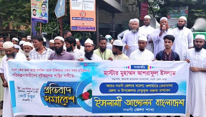 নওগাঁয় কোর জামে মসজিদ ভেঙ্গে অ্যাডভোকেটদের অফিস বানানোর প্রতিবাদে মানববন্ধন করেছে ইসলামী আন্দোলন বাংলাদেশ নওগাঁ জেলা শাখা।রোববার (৮ সেপ্টেম্বর) সকাল সাড়ে ১০ টার দিকে জেলা আদালত চত্ত্বরে এ মানববন্ধন কর্মসূচি পালন করা হয়।ইসলামী আন্দোলন বাংলাদেশ এর সভাপতি মাস্টার মো. আশরাফুল ইসলামের সভাপতিত্বে ও ইসলামী ছাত্র আন্দোলনের সভাপতি মুহাম্মদ নাজমুল হোসেনের সঞ্চালনায় মানববন্ধনে বক্তারা বলেন, অত্র মসজিদ স্থাপিত হওয়ার মূল ভিত্তির ছায়ালিপিসহ প্রতিবেদন আগামী ২০ সেপ্টেম্বরের মধ্যে মসজিদ পরিচালনা পর্ষদের পক্ষ থেকে আন্দোলন কারীদের নিকট পেশ করা হবে। আনুমানিক ২০ থেকে ২২ বছর পর কোন সিদ্ধান্তের উপর নির্ভর করে উক্ত মসজিদ ভেঙ্গে উকিলদের চেম্বার করার সিদ্ধান্ত নেওয়া হয় তার লিখিত ফতোয়া আন্দোলনকারীদের নিকট পেশ করতে হবে। উক্ত মসজিদ ভেঙ্গে উকিল চেম্বার করার ক্ষেত্রে যাদের নিকট হতে অর্থ নেওয়া হয়েছে তার সঠিক ব্যবহার হয়েছে কি না তার সুষ্ঠু তদন্ত সাপেক্ষে তার প্রতিবেদন পেশ করতে হবে। উক্ত দাবী সমূহ পূরণ না হওয়া পর্যন্ত অত্র মসজিদের নীচতলায় সালাত আদায় করা ও অজু খানাসহ যা কিছু ভাঙ্গা হয়েছে তা পুনরায় মেরামত করতে হবে। চুড়ান্ত সমাধান না হওয়া পর্যন্ত যাদের নিকট থেকে অর্থ নেওয়া হয়েছে তাদের পনর্বাসনের ব্যবস্থা করা বা অর্থ ফেরৎ এর ব্যবস্থা করতে হবে।