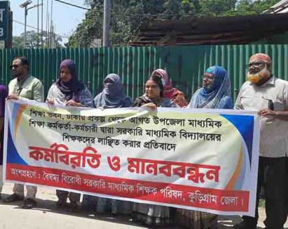 সেসিপ প্রকল্প থেকে আগত বিভিন্ন শিক্ষা কর্মকর্তাদের জেলা শিক্ষা অফিসার পদে পদায়নের অযৌক্তিক দাবী ও শিক্ষকদের উপর হামলার প্রতিবাদে কুড়িগ্রামে পূর্ণদিবস কর্মবিরতি ও মানববন্ধন করছে বৈষম্যবিরোধী শিক্ষক পরিষদ।