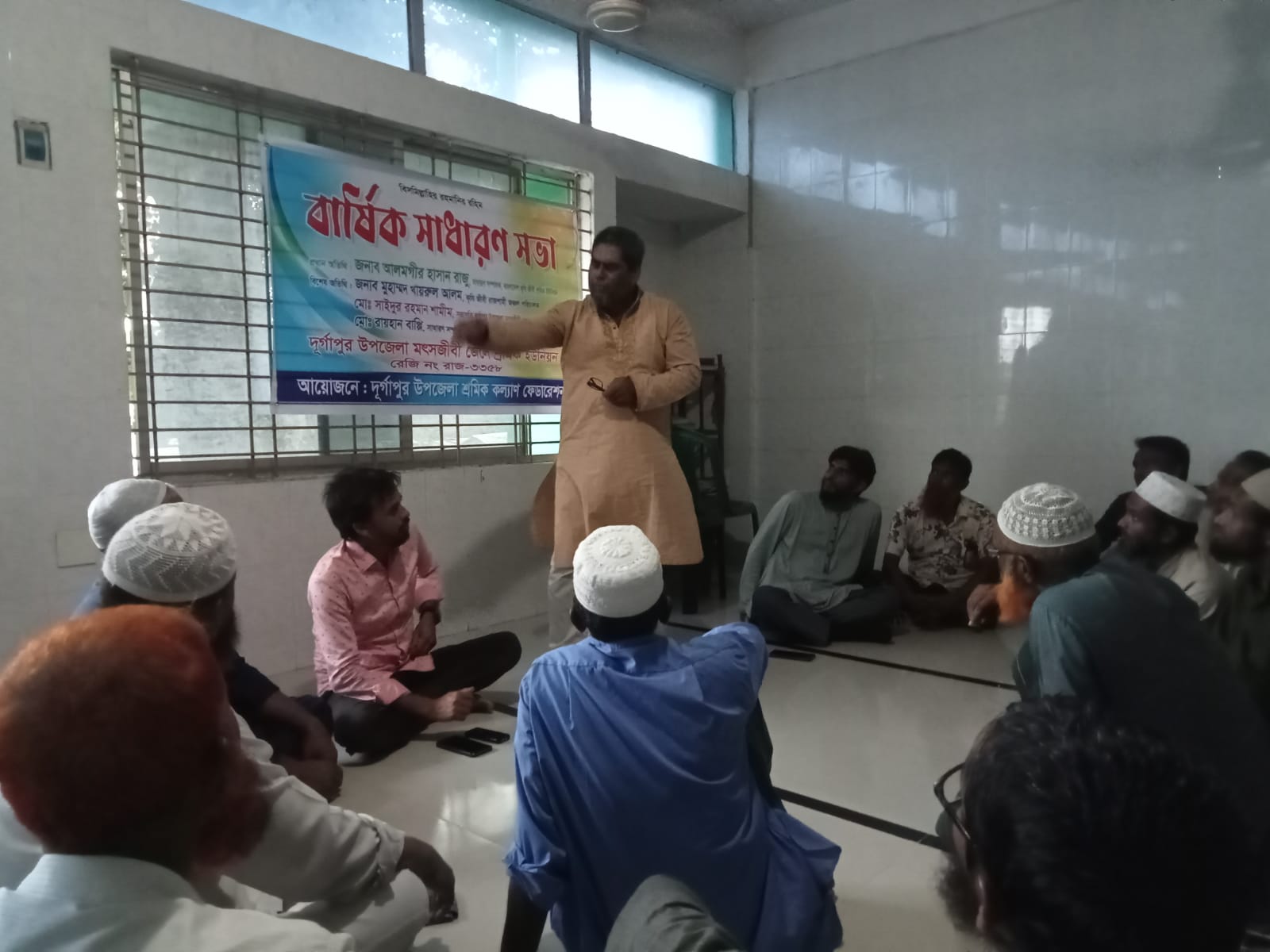 রাজশাহী দুর্গাপুর উপজেলা শ্রমিক কল্যাণ ফেডারেশন বার্ষিক সাধারণ সভা অনুষ্ঠিত হয়।শুক্রবার ২০ সেপ্টেম্বর ২০২৪ সন বিকাল ৫ ঘটিকায় দুর্গাপুর কেন্দ্রীয় জামে মসজিদে এই সভা অনুষ্ঠিত হয়ে থাকে।