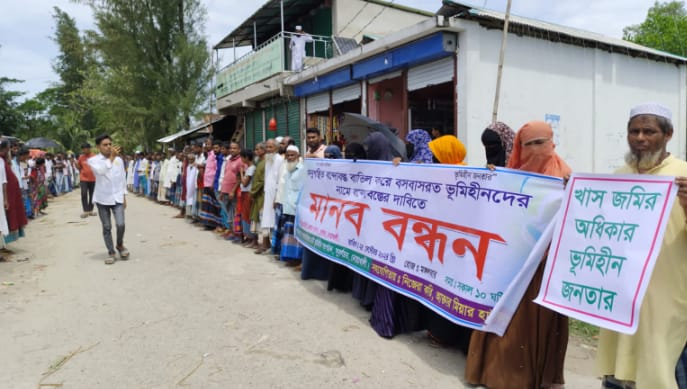 নোয়াখালীর সুবর্ণচর উপজেলার চরক্লার্ক ইউনিয়নে নদী ভাঙা ভূমিহীন অসহায় ৩ হাজার পরিবারকে উড়িরচর ও পশ্চিম চর উরিয়া মৌজায় সরকারি খাস জমি বন্দোবস্ত দেওয়ার দাবিতে মানববন্ধন ও বিক্ষোভ কর্মসূচি পালন করেছে।