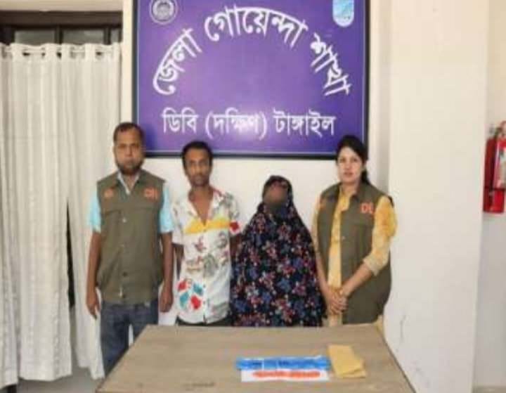 ডিবি (দক্ষিণ), টাঙ্গাইল জেলা পুলিশের একটি চৌকস টিম গোপালপুর থানাধীন নলিন বাজার এলাকায় অবৈধ অস্ত্র, মাদকদ্রব্য উদ্ধার ও বিশেষ অভিযানের চলমান অংশ হিসাবে অভিযান পরিচালনা কালে গোপন সংবাদের ভিত্তিতে জানতে পারে, গোপালপুর থানাধীন শাখারিয়া সাকিনস্থ জনৈক মোঃ মনিরুজ্জামান (৫৫) এর উত্তর দুয়ারী চৌচালা টিনের বসত ঘরের পশ্চিম পার্শ্বের রুমের ভিতর কতিপয় মাদক ব্যবসায়ী অবৈধভাবে মাদকদ্রব্য ইয়াবা বিক্রয়ের উদ্দেশ্যে অবস্থান করছে। উক্ত সংবাদের সত্যতা যাচাই এবং আইনগত ব্যবস্থা গ্রহণের জন্য ঊর্ধ্বতন কর্তৃপক্ষকে অবহিত করে ডিবি (দক্ষিণ), টাঙ্গাইলের চৌকস টিমটি ঘটনাস্থলে অভিযান পরিচালনা করে ১,৪০০ (এক হাজার চারশত) পিস ইয়াবা উদ্ধারসহ ধৃত আসামী মোসাঃ নুরজাহান খাতুন (৪৮), স্বামী মোঃ মনিরুজ্জামান, গ্রাম-শাখারিয়া, থানা-গোপালপুর, জেলা-টাংগাইল এবং মোঃ রোকনুজ্জামান রোকন খান (৩০), পিতা মোঃ লাল খান, গ্রাম জগৎপুরা, থানা-ভূঞাপুর, জেলা টাঙ্গাইল দ্বয়কে ২১ অক্টোবর সোমবার সকাল ৮টায় গ্রেফতার করে।