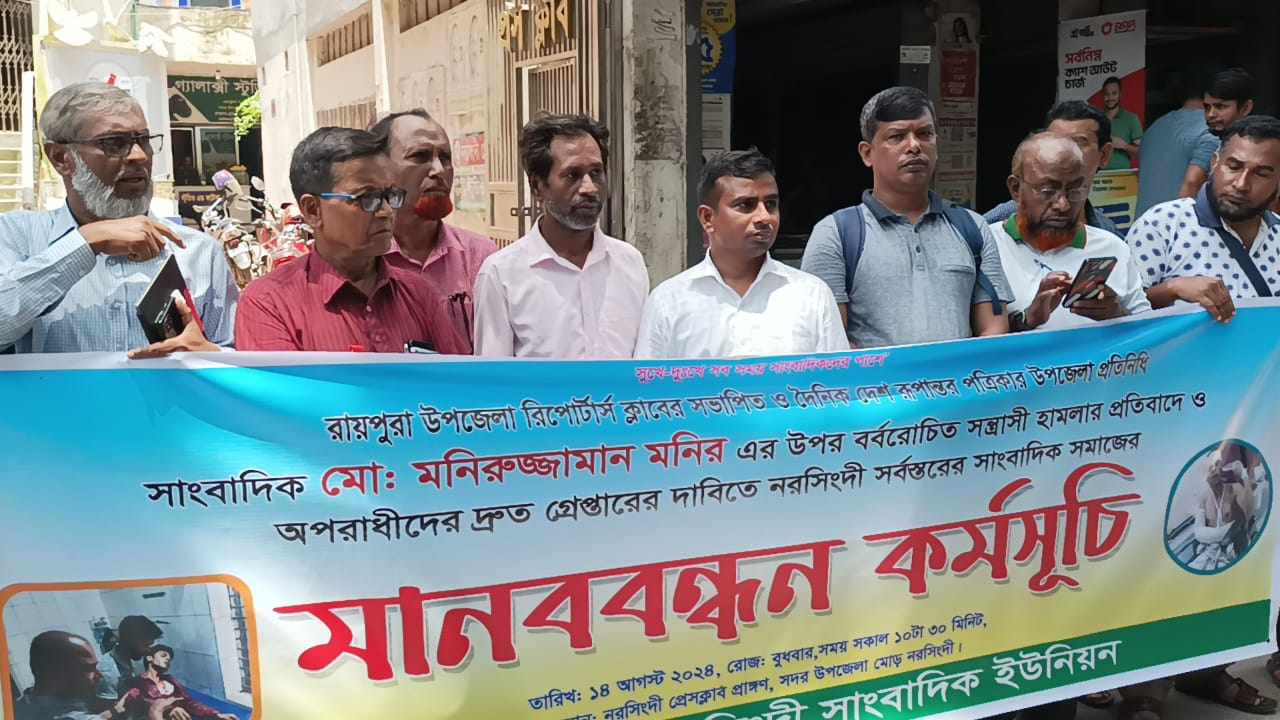 নরসিংদীর রায়পুরায় মনিরুজ্জামান মনির (৪০) নামে স্থানীয় এক সাংবাদিককে গুলি করে ও হাতুড়ি দিয়ে পিটিয়ে গুরুতর আহত করেছে দুর্বৃত্তরা। এর বিচার চেয়ে বুধবার (১৪ আগস্ট) দুপুরে মানববন্ধন করেছে নরসিংদীর সর্বস্তরের সাংবাদিকবৃন্দ। মনিরুজ্জামানের উপর বর্বরোচিত হামলার ঘটনায় তীব্র নিন্দা জ্ঞাপন করে অনতিবিলম্বে সন্ত্রাসীদের আইনের আওতায় এনে দৃষ্টান্ত মুলক বিচারের দাবী জানান মানববন্ধনের বক্তারা।