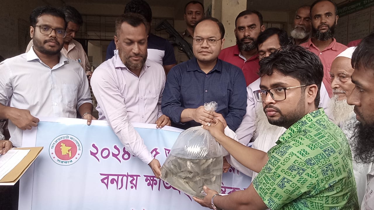 সেনবাগে বন্যায় ক্ষতিগ্রস্হ প্রান্তিক মৎস্য চাষীদের মাঝে পোনামাছ বিতরণ