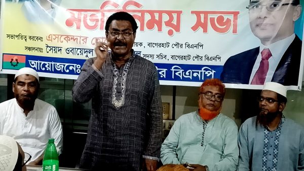 বিএনপির ভারপ্রাপ্ত চেয়ারম্যান তারেক রহমান কর্তৃক ঘোষিত রাষ্ট্র কাঠামো মেরামতের ৩১ দফার জনমত তৈরির ল¶্যে বাগেরহাট পৌরসভা ৯ নং ওয়ার্ড বিএনপির মত বিনিময় সভা অনুষ্ঠিত হয়েছে। শুক্রবার (৮ নভেম্বর) সন্ধ্যায় বাগেরহাট পৌর বিএনপির কার্যালয়ে এ মত বিনিময় সভার আয়োজন করা হয়। বাগেরহাট পৌর বিএনপির আহবায়ক এস্কেন্দার হোসেনের সভাপতিত্বে ও সদস্য সচিব সৈয়দ ওবায়েদুল ইসলাম জুয়েলের সঞ্চলনায় অনুষ্ঠিত মতবিনিময় সভায় বক্তৃতা করেন পৌর বিএনপির যুগ্ম আহবায়ক মল্লিক মোবাশে^র হোসেন রুবেল, এ্যাডঃ হিরোক মিনা, জেলা শ্রমিক দলের সভাপতি সরদার আতিয়ার হোসেন, ওয়ার্ড বিএনপির সভাপতি এ্যাডঃ শরিফুল ইসলাম ঠান্ডু, সাবেক সভাপতি এ্যাডঃ আব্দুল কাদের, সাবেক পিসিকলেজের ভিপি সরদার নাসির উদ্দিন লনি, বিএনপি নেতা এ্যাডঃ নজরুল ইসলাম কাজোল, মোঃ বাবলু মোল্লা, ফকির হাফিজুর রহমান সহ পৌরসভার অন্যান্য নেতৃবৃন্দ উপস্থিত ছিলেন। সভায় বক্তারা বলেন, দেশে এখনো আওয়ামী লীগের সন্ত্রাসীরা বিভিন্ন ষড়যন্ত্র করার অপচেষ্টা চালাচ্ছে। সকল কে সাবধানতা অবলম্বন করে মোকাবিলা করতে হবে। বিগত দিনে তারা আমাদের নেতাকর্মীদের মামলা হামলা করে, ঘর-বাড়ি দোকানপাট ভাঙচুর অগ্নিসংযোগ সহ বিভিন্ন ভাবে আমাদেরকে হয়রানি করেছে। তার উচিত জবাব দেওয়ার সময় এসেছে। আর বসে থাকা যাবে না। বেগম খালেদা জিয়া ও তারেক রহমানের হাত কে শক্তিশালি করার আহবান জানান সভায় উপস্থিত বক্তারা। দলের নাম ভাঙ্গিয়ে কে চাঁদাবাজি বা অন্য কোন অপকর্মে লিপ্ত হলে তাদের বিরুদ্ধে কঠোর ব্যবস্থা গ্রহন করা হবে বলেও হুঁশিয়ারি উচ্চারণ করেন নেতৃবৃন্দ ।