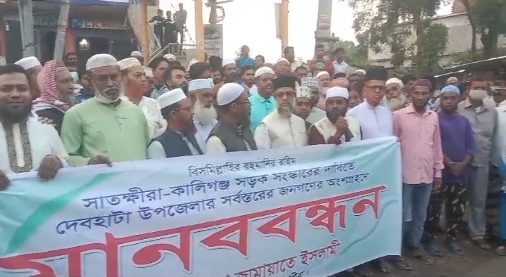 দেবহাটায় জামায়াতে ইসলামীর আয়োজনে সাতক্ষীরা-কালীগঞ্জ সড়ক সংস্কারে মানববন্ধন