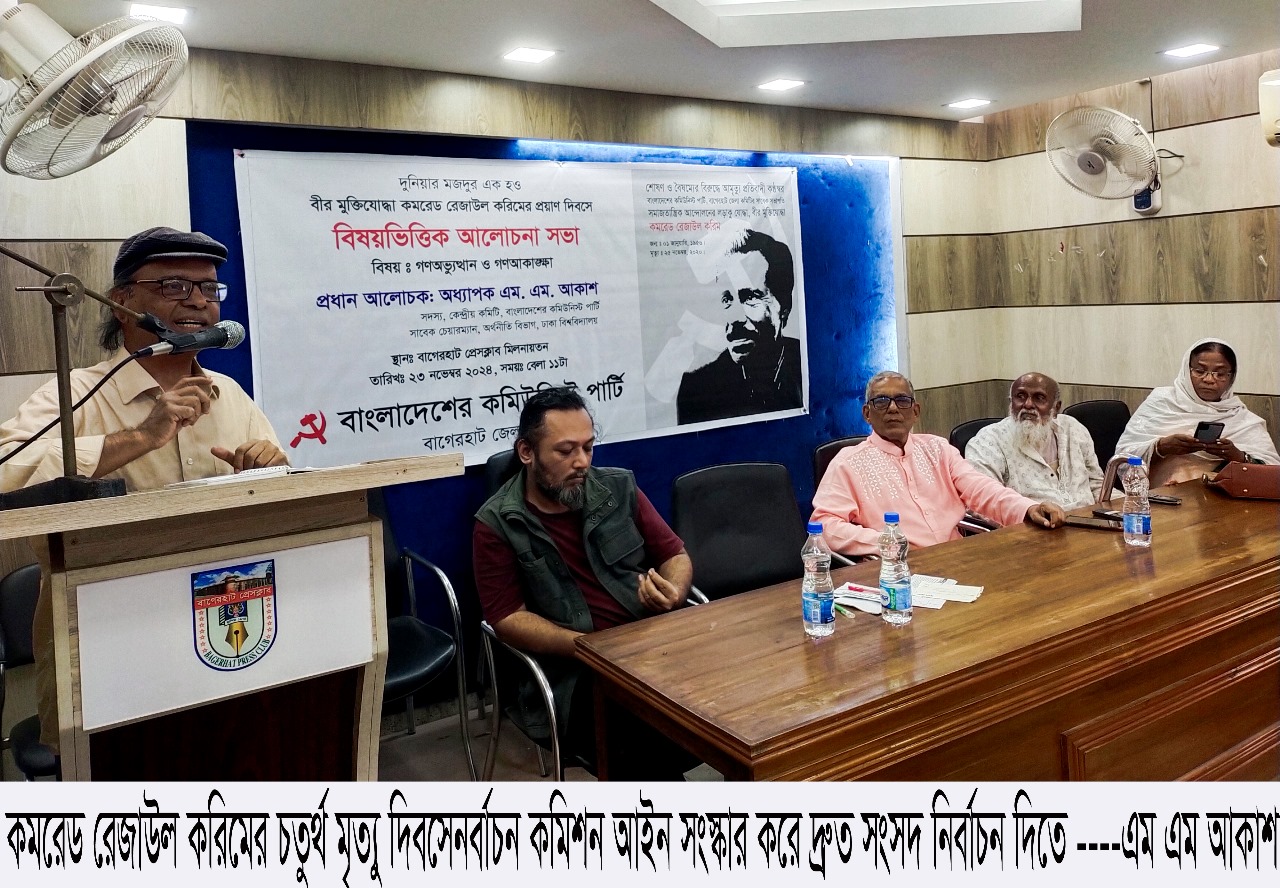 নির্বাচনে অংশ গ্রহনকারি দলের প্রাপ্ত ভোটের সংখ্যানুপাতে এমপি নির্বাচনের বিধান করতে হবে। প্রধান উপদেষ্টার প্রতি এই আহবান জানিয়ে তিনি বলেন, তবেই জাতীয় সংসদ গনমানুষের আস্থার প্রতীকে পরিনত হবে। ৫ আগষ্ট ছাত্র-জনতার বিপ্লবের পর গন মানুষের এই চেতনা বাস্তবায়নে কমিউনিস্ট পািির্টর সারা দেশে কাজ করছে। শনিবার দুপুরে বাগেরহাট জেলা কমিউনিস্ট পার্টির সাবেক সভাপতি বীর মুক্তিযোদ্ধা কমরেড রেজাউল করিমের চতুর্থ মৃত্যু দিবসে ‘গণঅভ্যুন্থান ও গণচেতনা বিষষ ভিত্তিক আলোচনা সভায় আলোচনা সভায় প্রধান অতিথির বক্তব্যে অধ্যাপক এম এম আকাশ একথা বলেন।