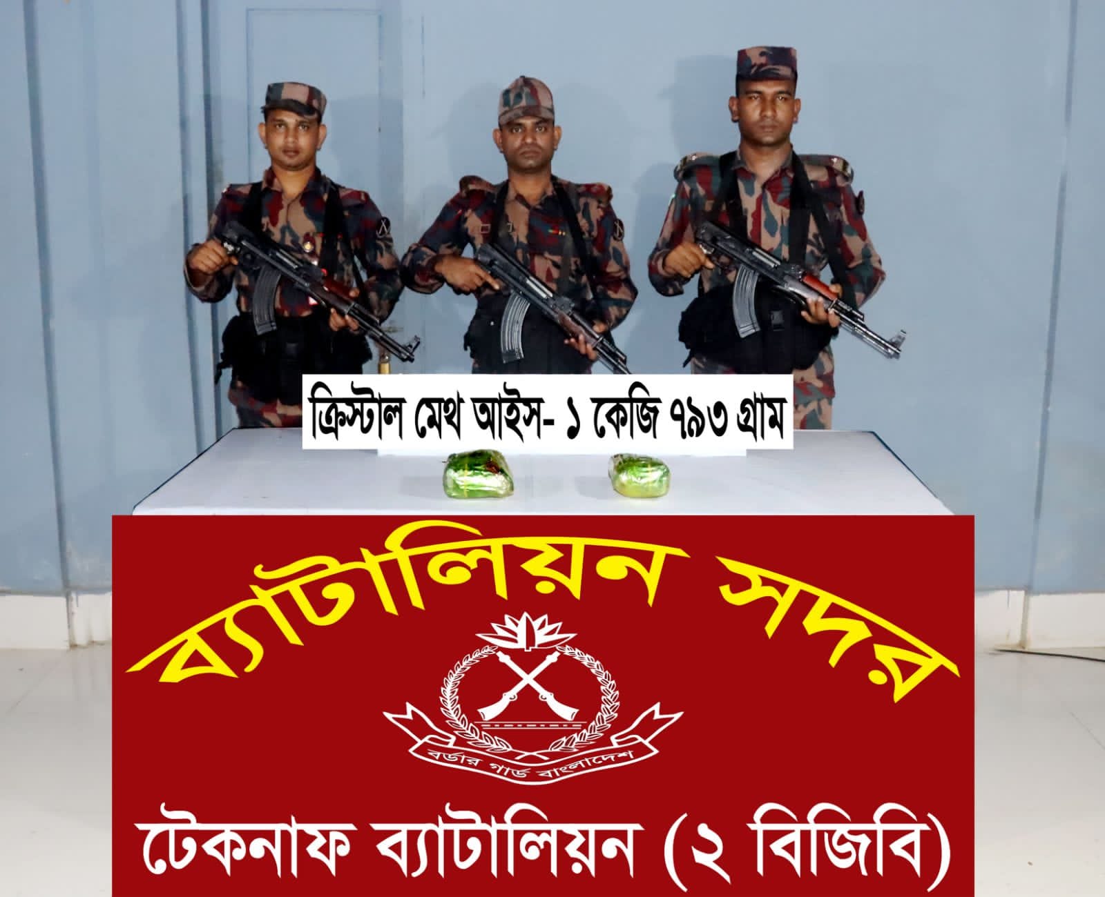 গোপন সংবাদের ভিত্তিতে টেকনাফ পৌরসভার নাইট্যংপাড়া সীমান্ত এলাকার পরিত্যক্ত একটি বস্তি বাড়িতে পাচারের উদ্দেশ্যে মায়ানমার থেকে আনীত মাদকদ্রব্য লুকায়িত রয়েছে। এমন সংবাদের ভিত্তিতে টেকনাফ ব্যাটালিয়ন সদরের একটি মাদকবিরোধী আভিযানিক দল উক্ত স্থানে গমন করে তল্লাশি অভিযান পরিচালনা করে। এসময় বিজিবির উপস্থিতি টের পেয়ে রাতের অন্ধকারের সুযোগে দুইজন ব্যক্তি ঘরের পিছন দিয়ে দ্রুত পালিয়ে যায়। পরবর্তীতে টহলদল তল্লাশি চালিয়ে পরিত্যক্ত ঘরের এক কোণে গর্ত খুঁড়ে জাল দিয়ে মোড়ানো একটি প্লাস্টিকের ব্যাগের ভিতর থেকে ১ কেজি ৭৯৩ গ্রাম ক্রিস্টাল মেথ আইস উদ্ধার করতে সক্ষম হয়।