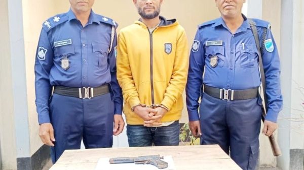 নরসিংদীর মডেল থানার মামলার নং-০৯,তারিখ-০৬/১২/২০২৪ খ্রিঃ ধারা- The Arms Act 1878 এর 19-A ,নরসিংদী মডেল থানার মামলা নং-২৪, তারিখ-২৯/১০/২০২৪ খ্রিঃ, ধারা-৩৯৯/৪০২ পেনাল কোড এর এজাহারনামীয় পলাতক আসামী তাজু মিয়া কে গ্রেফতারের লক্ষ্যে থানা এলাকায় পুলিশ অভিযান পরিচালনা করিয়া ইং ০৫/১২/২০২৪ খ্রিঃ তারিখ রাত অনুমান ২৩.১০ ঘটিকার সময় নরসিংদী মডেল থানাধীন রজনিগন্ধা চত্তর হইতে আসামী ১। তাজু মিয়া(২৭), পিতা-সুরুজ মিয়া, সাং-উত্তর নাগরিয়াকান্দি,থানা ও জেলা-নরসিংদীকে গ্রেফতার করা হয়। আসামীর বিরুদ্ধে পূর্বেও ডাকাতি,দস্যুতা,খুন, ছিনতাই ও মাদক সহ একাধিক মামলা রহিয়াছে বিধায় আসামীকে গ্রেফতারের পর থানা হেফাজতে রাখিয়া নিবিরভাবে পর্যায়ক্রমে জিজ্ঞাসাবাদ করা হয়। জিজ্ঞাসাবাদের একপর্যায়ে আসামী স্বীকার করে যে, তাহার হেফাজতে ০১ (এক)টি আগ্নেয়াস্ত্র আছে। আসামীর দেওয়া তত্ত্বের ভিত্তিতে নরসিংদী মডেল থানার একটি টিম আসামীকে সাথে নিয়া অভিযান পরিচালনা করিয়া ইং অদ্য ০৬/১২/২০২৪ খ্রিঃ তারিখ রাত অনুমান ০০.৩ ঘটিকার সময় উত্তর নাগরিয়াকান্দি সাকিনস্থ ধৃত আসামী তাজু মিয়ার বসত বাড়ীর ২য় তলায় তাহার থাকার রুমে খাটের উপর তোশকের নিচ হইতে আসামীর দেখানো ও নিজ হাতে বাহির করিয়া দেওয়ামতে ০১(এক) টি লোহার তৈরী কাঠের বাটযুক্ত ওয়ান শুটারগান,লম্বা অনুমান-১০ ইঞ্চি,যাহা টেগার ও ফায়ারিং পিন সংযুক্ত উদ্ধার পূর্বক জব্দ করা হয়। ধৃত আসামীকে অস্ত্রের বিষয়ে জিজ্ঞাসাবাদ করিলে সে জানায় যে, আগ্নেয়াস্ত্রটির প্রকৃত মালিক পলাতক আসামী ২। রনি সরকার ওরফে শরীফ (৩৭), পিতা-ইসমাইল সরকার ওরফে নুরু সরকার, সাং-নাগরিয়াকান্দি, থানা ও জেলা-নরসিংদী। পলাতক আসামী রনি সরকার ওরফে শরীফ তাহার উক্ত আগ্নেয়াস্ত্রটি কয়েক দিনের জন্য ধৃত আসামী তাজু মিয়ার নিকট রাখিয়াছে বলিয়া ধৃত আসামী জানায়। ধৃত আসামী এবং পলাতক আসামী একে অপরের জ্ঞাতসারে অবৈধ আগ্নেয়াস্ত্র নিজেদের হেফাজত রাখিয়া এলাকায় ডাকাতি, দস্যুতা,খুন ও ছিনতাই সহ বিভিন্ন ধরনের অপকর্ম করিয়া আসিতেছে মর্মে জানা যায়। ধৃত আসামীর বিরুদ্ধে ডাকাতি, দস্যুতা, খুন, ছিনতাই, অস্ত্র ও মাদক মামলা সহ ১০ (দশ) টি মামলা রয়েছে। ধৃত আসামী এবং পলাতক আসামীর বিরুদ্ধে অস্ত্র আইনে নিয়মিত মামলা রুজু করিয়া ধৃত আসামীকে পুলিশি প্রহরায় বিজ্ঞ আদালতে প্রেরণ করা হয়েছে।