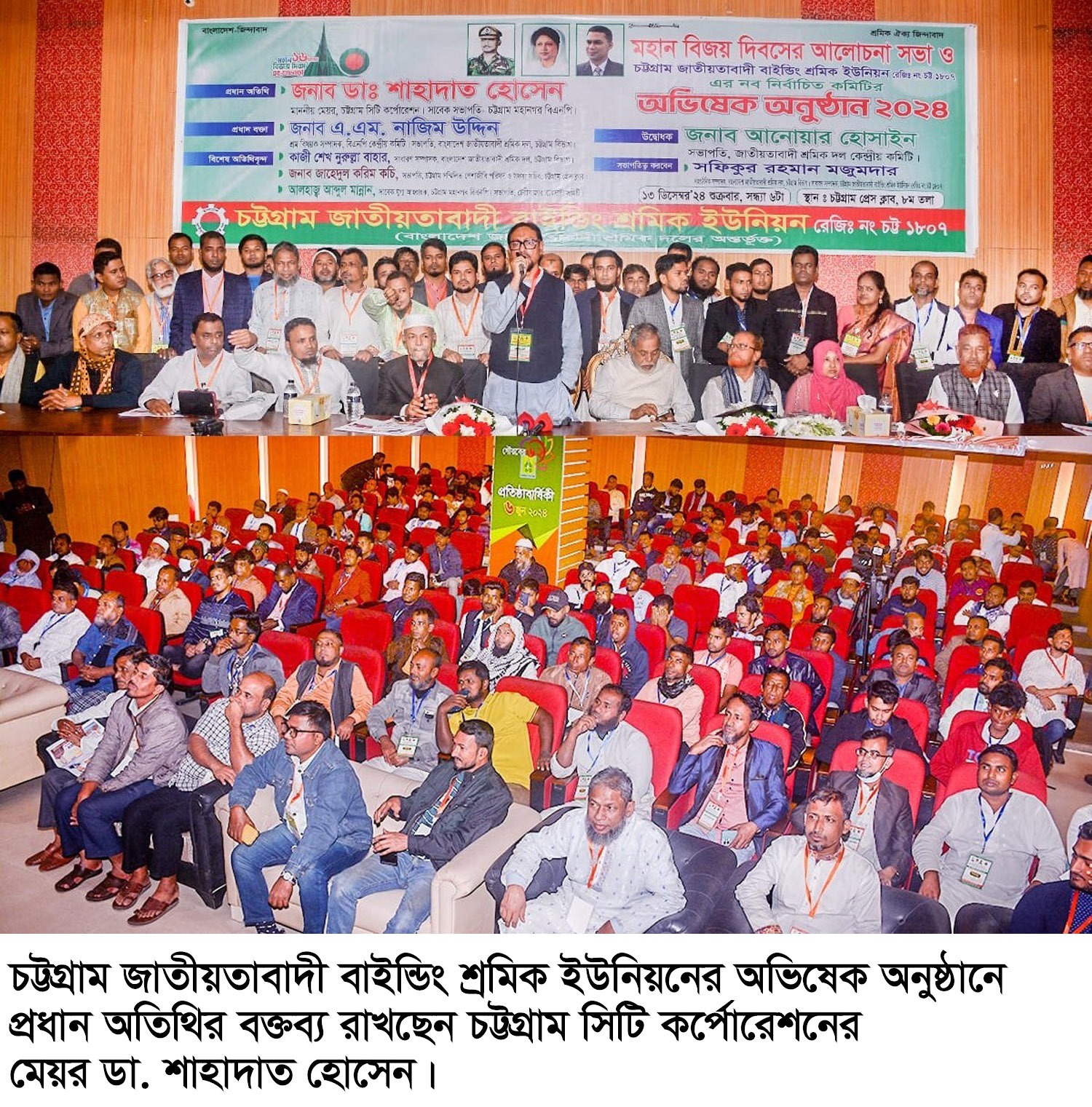 অদ্য সন্ধ্যা ৭ ঘটিকায় চট্টগ্রাম প্রেস ক্লাবের চট্টগ্রাম জাতীয়তাবাদী বাইন্ডিং শ্রমিক ইউনিয়ন-এর অভিষেক ও বিজয় দিবস উপলক্ষে এক আলোচনা সভা সফিকুল ইসলাম মজুমদারের সভাপতিত্বে অনুষ্ঠিত হয়। প্রধান অতিথির বক্তব্য রাখতে গিয়ে চট্টগ্রাম সিটি কর্পোরেশনের মেয়র ডা. শাহাদাত হোসেন বলেন, দেশে গণতন্ত্র মুক্তির আন্দোলনে বৈষম্য বিরোধী আন্দোলন, সংগ্রামে শ্রমিকদের ভূমিকা কখনও অস্বীকার করা যাবে না। চট্টগ্রাম নগরকে জনস্বার্থে পরিষ্কার পরিচ্ছন্ন রাখার জন্য শ্রমিক সংগঠনগুলোর সর্বাত্মক সহযোগিতা প্রয়োজন। কথিত ফ্যাসিস্ট স্বৈরাচার দোসররা আবার মাথাচাড়া দিয়ে উঠার পায়তারা করছে। তা কখনো হতে দেওয়া যাবে না। এদেশের জনগণকে সাথে নিয়ে শ্রমিক জনতা আবার প্রতিরোধ গড়ে তুলবে। বাইন্ডিং শ্রমিকদের আন্দোলন সংগ্রামের ইতিহাস গণতান্ত্রিক আন্দোলনে একটি ঐতিহ্য বহন করে। বিএনপির ভারপ্রাপ্ত চেয়ারম্যান তারেক রহমানের নেতৃত্বে আগামীতে গণতন্ত্র পুনর্গঠন ও ৩১ দফার আলোকে দেশ সংস্কারের যেই পদক্ষেপ নিয়েছেন তা বাস্তবায়ন করা একান্ত জরুরী। এজন্য গণতান্ত্রিক রাষ্ট্র প্রতিষ্ঠা করতে একটি অবাধ, সুষ্ঠু ও নিরপেক্ষ নির্বাচন করা দরকার। প্রধান বক্তা বীর মুক্তিযোদ্ধা এ এম নাজিম উদ্দীন বলেন, স্বৈরাচারি হাসিনা দেশ ছেড়ে পালিয়ে গিয়ে তার দলের অসংখ্য সমর্থক ও দোসরদের যেভাবে বিপদে ফেলে গেছে দেশের বিরুদ্ধে বিশ্বব্যাপি ষড়যন্ত্র করে দেশেবাসীকেও বিপদের ফেলার পায়তারায় লিপ্ত রয়েছে। দেশের মানুষ কখনো তা বাস্তবায়ন হতে দেবে না। বর্তমান অন্তবর্তী সরকারের প্রতি অনুরোধ, শ্রমিকদের রুটি রুজি ক্রয় ক্ষমতার বাইরে চলে গেছে। বর্তমানে বাজার নিয়ন্ত্রণ করে দ্রব্যমূল্য কমানো একান্ত প্রয়োজন হয়ে পড়েছে। শ্রমিকদের কল্যাণের স্বার্থে নুন্যতম মজুরি কমিশন ঘোষণার দাবি জানাচ্ছি। এজন্য দেশে একটি গণতান্ত্রিক সরকার গঠন করা অতি জরুরি। উদ্বোধনী বক্তব্য প্রদানকালে শ্রমিক দলের কেন্দ্রীয় সভাপতি আনোয়ার হোসেন বলেন, বাইন্ডিং শ্রমিকদের বিপ্লবী সংগ্রামের কথা বীর মুক্তিযোদ্ধা আবদুল্লাহ আল নোমান যেভাবে আমাদেরকে স্মরণ করিয়ে দিতেন তাতে আমরা মনে করি এই সংগঠনের গুরুত্ব অত্যধিক। যে কারণে অন্যান্য শ্রমিক সংগঠনের তুলনায় বাইন্ডিং শ্রমিক দলে বিভিন্ন দাবি দাওয়ার প্রতি গুরুত্ব প্রদান করা দরকার। অনুষ্ঠানে প্রধান অতিথি ছিলেন, চট্টগ্রাম সিটি কর্পোরেশনের মেয়র ডা. শাহাদাত হোসেন। প্রধান বক্তা ছিলেন বিএনপির কেন্দ্রীয় শ্রমিক সম্পাদক, চট্টগ্রাম বিভাগীয় শ্রমিক দলের সভাপতি বীর মুক্তিযোদ্ধা এ এম নাজিম উদ্দীন। উদ্বোধনী বক্তব্য রাখেন শ্রমিক দলের কেন্দ্রীয় সভাপতি আনোয়ার হোসেন। বিশেষ অতিথি কাজী শেখ 
