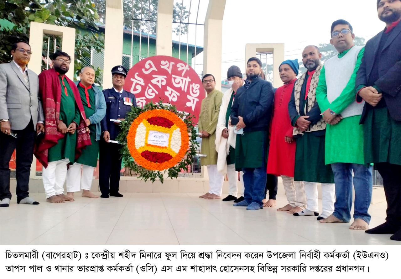 বাগেরহাটের চিতলমারীতে যথাযোগ্য মর্যদায় মহান বিজয় দিবস পালিত হয়েছে। সোমবার (১৬ ডিসেম্বর) ভোরে ৩১ বার তোপধ্বনির মাধ্যমে দিবসটির শুভ সূচনা করা হয়। শুভ সূচনার পর কেন্দ্রীয় শহীদ মিনারে ফুল দিয়ে শ্রদ্ধা নিবেদন করেন উপজেলা নির্বাহী কর্মকর্তা (ইউএনও) তাপস পাল ও থানার ভারপ্রাপ্ত কর্মকর্তা (ওসি) এস এম শাহাদাৎ হোসেন। পরে উপজেলা মুক্তিযোদ্ধা কমান্ড, থানা পুলিশ, বাংলাদেশ জাতীয়তাবাদী দল (বিএনপি) চিতলমারী উপজেলা শাখা, সরকারি, বেসরকারি দপ্তর, শিক্ষা প্রতিষ্ঠানসহ বিভিন্ন সংগঠন ফুল দিয়ে শ্রদ্ধা জ্ঞাপন করেন। এ দিন সকাল সাড়ে ৮ টায় উপজেলা পরিষদ চত্বরে আনুষ্ঠানিকভাবে জাতীয় পতাকা উত্তোলন করা হয়।